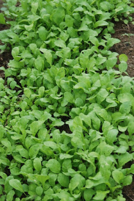 | 畝一面に芽を出して、元気いっぱいのルッコラ。 そろそろ、1回目の間引きをした方が良さそうだ。 |