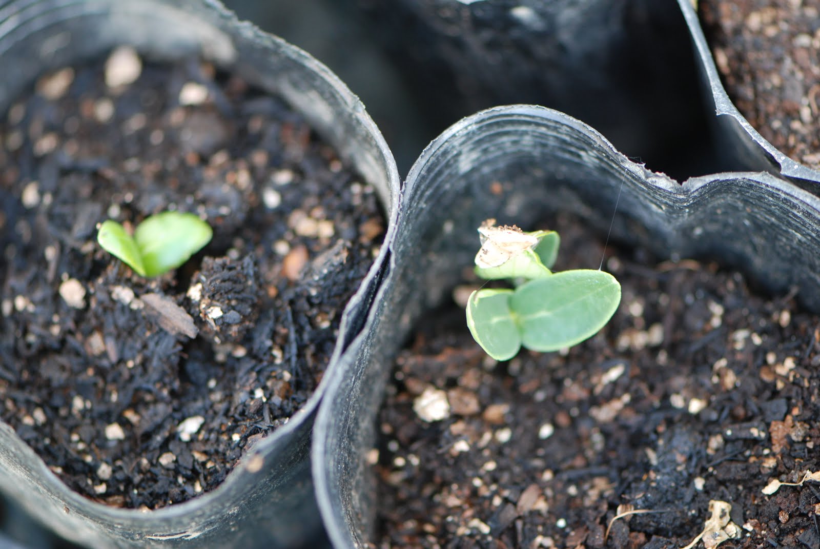 | 小さな双葉が顔を出し始めた。 4年目の種だったのでちょっと心配したが、まだ大丈夫だったようだ。 |