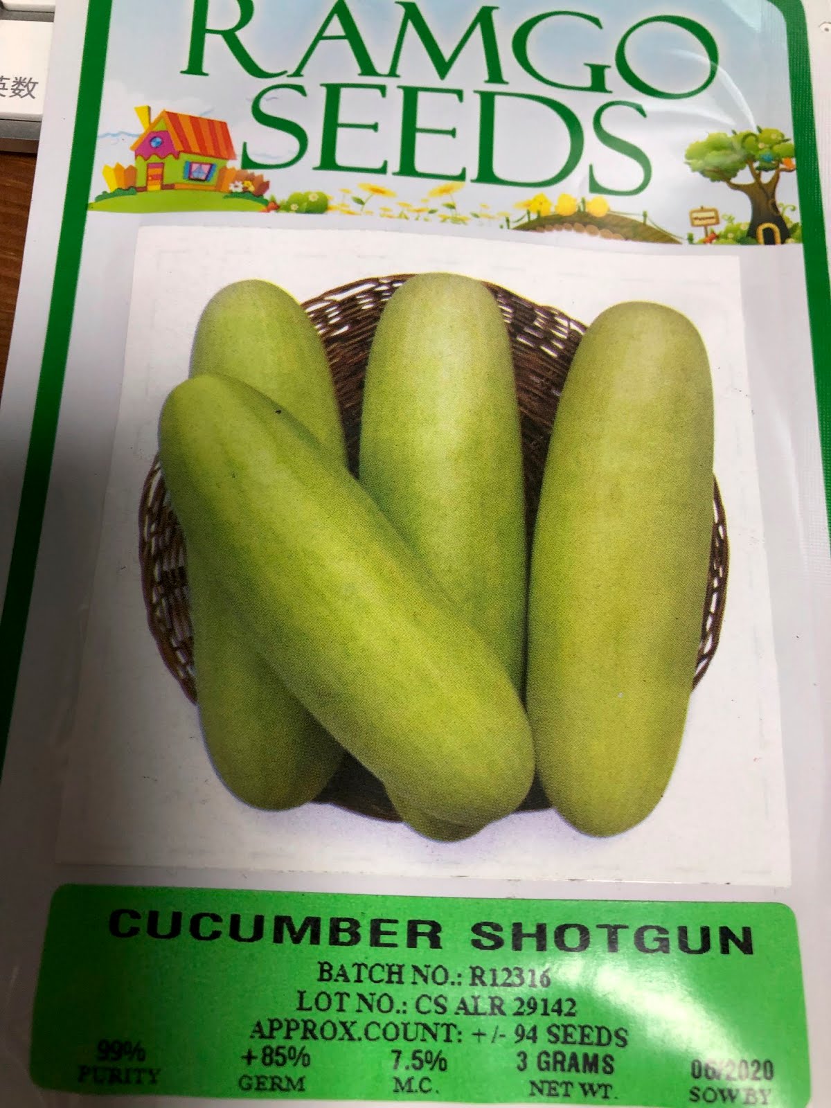 そこで、今年も5月の連休頃に通常のキュウリの苗を1〜2本購入し、キュウリの苗は揃うと思っていたのだが、2日ほど前に友人からまた別のタイプのキュウリの種を頂いた。『shotgun』という物騒な名前が付いている。