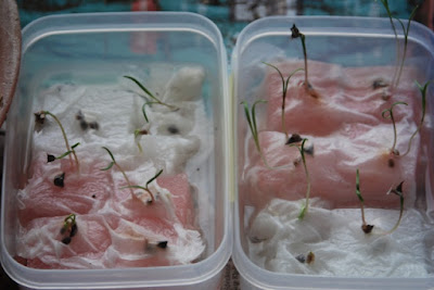 | 10日目;左がハイポニカ、右は水で芽出しを行った。 乾燥予防に1枚被せたトイレットペーパーが、少し重そうに思えた。 |