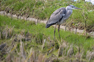| こちらは、稲刈りが終わった田んぼで遊ぶアオサギ。 |
