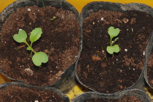 一方こちらは、ミミズ堆肥を入れたビニールポットで、窓辺に置いている苗。