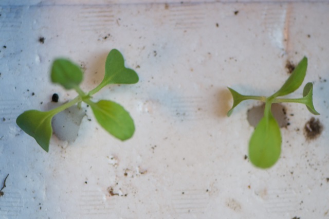 | だいたい本葉が2枚出ている。 双葉と本葉の大きさはほぼ同じ。 |