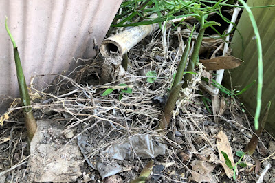 我が家でミョウガの新芽が出ているのは、プランターの間の空いたスペースと室外機の間や裏の狭いスペース。