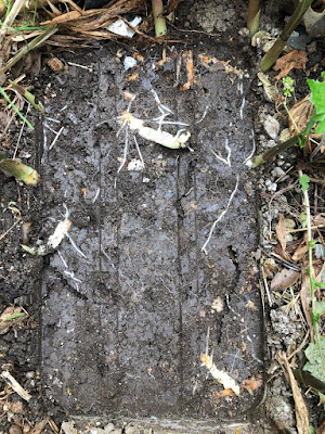 数日前種まきのため、ミョウガの芽が出ている側のプランターを移動させたのだが、そこに小さな白いミョウガの芽が横たわっていた。