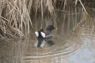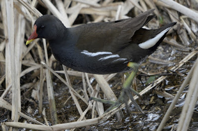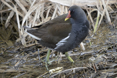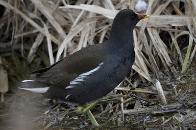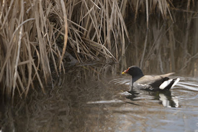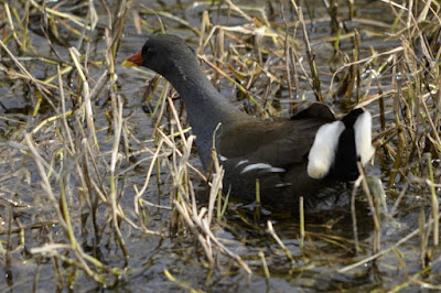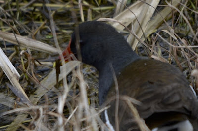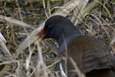 | 草陰にわずかに見えているバン。 とにかく、かくれんぼが上手なのだ。 しかしこんなあと、滅多にまた姿を確認することはできないのだ。 |