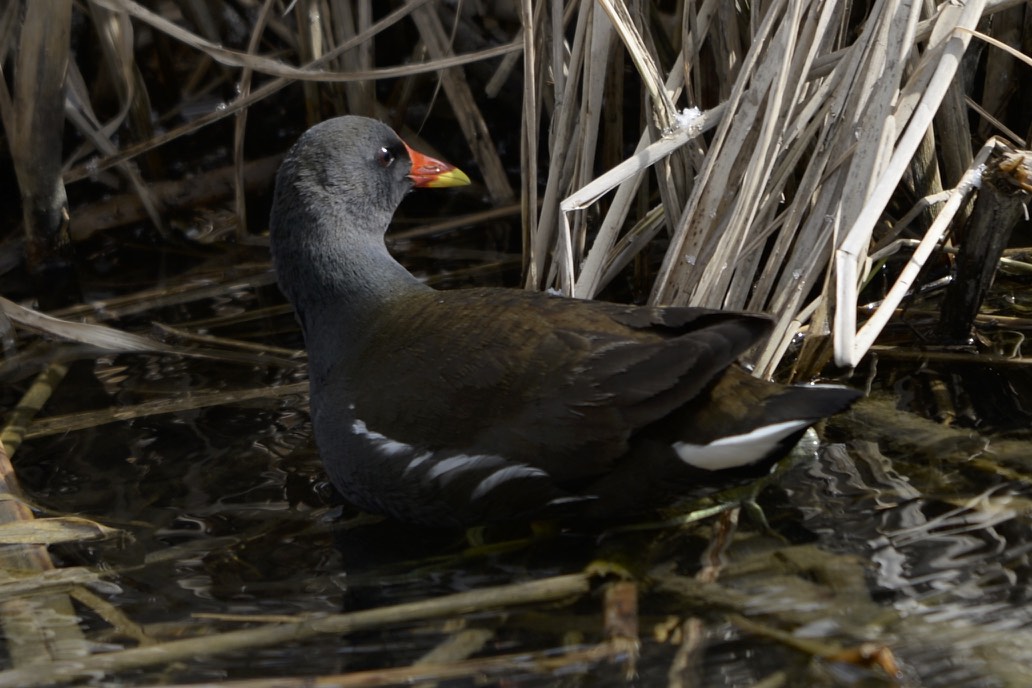 | 草陰にわずかに見えているバン。 とにかく、かくれんぼが上手なのだ。 しかしこんなあと、滅多にまた姿を確認することはできないのだ。 |