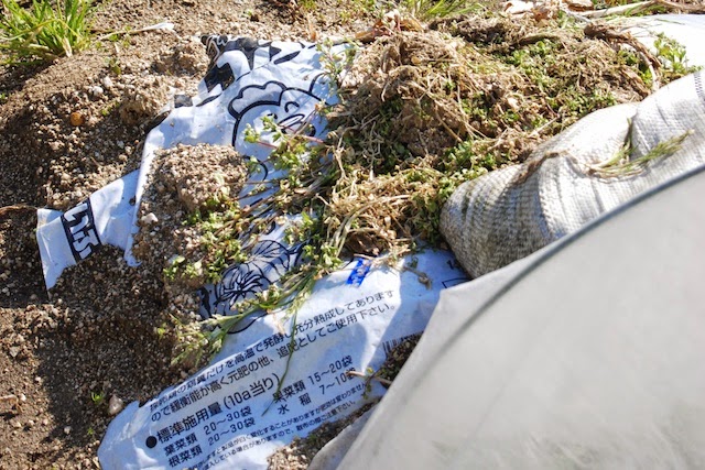 | このビニールと下かなりの深さにネットに入れておいたウコンの種芋がある。 |