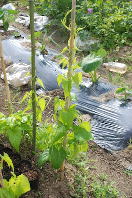 | この上では里芋を植え、その上にマルチを掛けていた。 芋の上にマルチをかける方法は初めてだった。 そして、マルチを下から突き上げる里芋の芽を待っていた。 ところが出てきた里芋は僅か2本。何が悪かったのか今とところ不明だ。 この畝に食べ忘れのツクネ芋を7個を植えた。 |