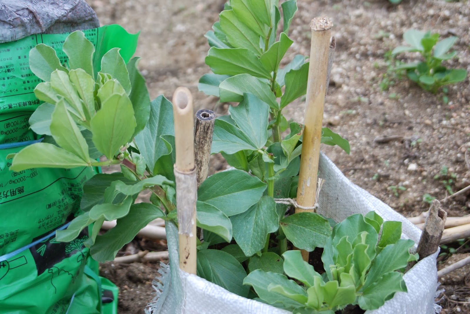 | こちらは土嚢袋に植えた空豆。側枝がどんどん伸びている。 写真で分かりにくいが日本産の空豆はすべて真ん中の枝を摘芯している。 |