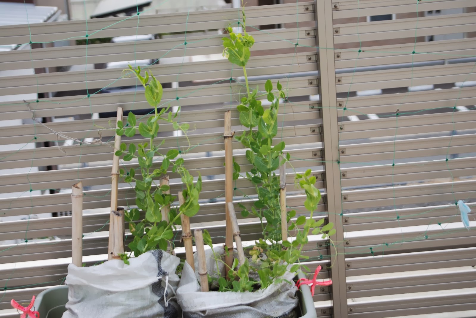 | 手前と奥と違った種類の豆の苗が見える。どちらも蔓の伸び加減は屋上苗より少ない。 また、これらの苗はまだ花も付けそうにない。 もう少し成長して花が咲くようになると、これらの苗がどの種類の豆かがはっきりするだろう。 |