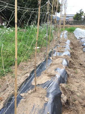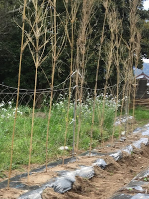 | この高さでは支柱の上の方に成った野菜は収穫できない? あとで、竹の先端だけは高枝バサミで切り落とそう。 |