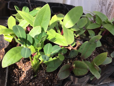 | こちらは落花生のポットに自然発生した多くのツルムラサキ。 一つの小さなポットに、ツルムラサキが10本以上出ていたのだ。 |