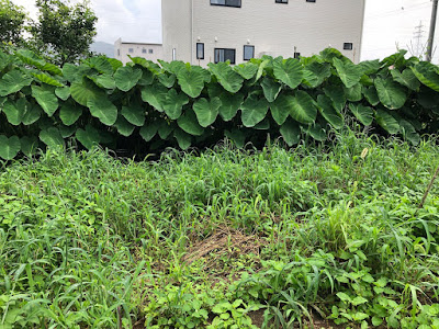 今年、ヤーコン以上に元気に育っている里芋もヤーコンの隣の畝で育っているが、低い壁状態だ。