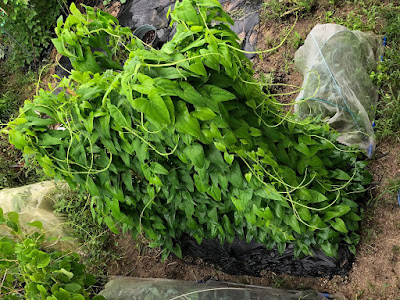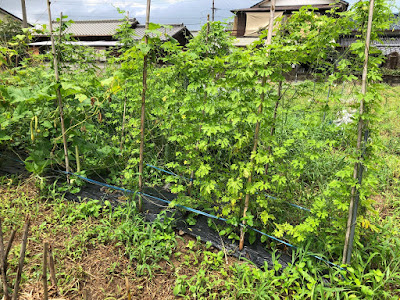 これからの畑仕事ではこんな『野菜の壁』が作る日除けスペースが熱中症予防の休憩場所になることもあるはずだ。