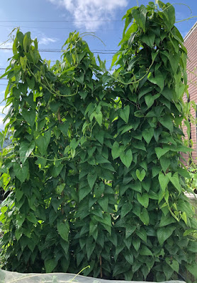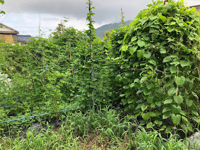 一方、こちらは色々な蔓野菜の混成チームだが、もうすぐ立派な壁になりそうだ。