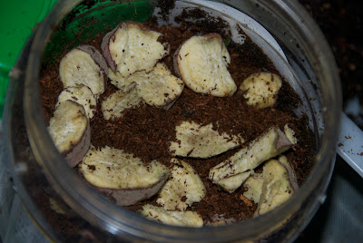 | 8匹のみみず君が慣れている芋類の餌がいいだろう。 餌として、里芋の皮、ジャガイモ、サツマイモ、ツクネ芋などを入れた。 |