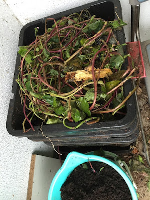 特に畑の側に置いているどんぶり3段やボックス3段ミミズ小屋には、餌としてのツルムラサキの量が凄い。