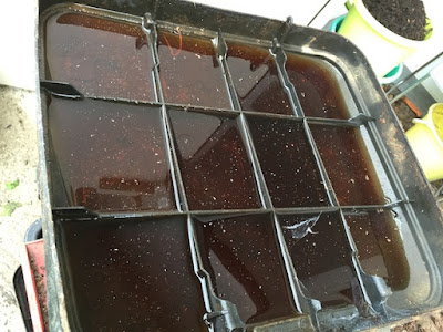 | この液肥の中にも、数匹のミミズ君がいた。 ボックスやどんぶり3段の液肥はすぐ側に畑があるので、そこに適当に撒いている |