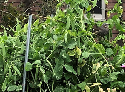 | ここのエンドウ豆だけは今のところ順調だったが、写真右上にヒヨドリが見える。 何とかこれ以上被害が広がらないように、明日にでも鳥よけネットを掛けよう。 |