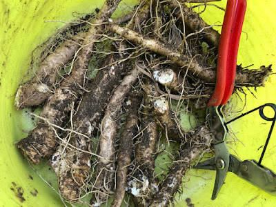 チコリー類の苗の下にはゴボウのような根が付いているが、今日も耕した時下の写真のような根が出てきた。