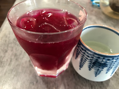 | こちらは今日作った梅紫蘇ジュースの試飲。 通常の紫蘇ジュースより酸味が強く、私には美味しく感じた。 |