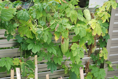 | 白ゴーヤとサラダゴーヤを1本づつ植えていた。 これまで十分食べる分は収穫出来ていたが、ここに来て急に実の育ちが悪くなった。 |