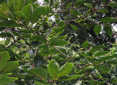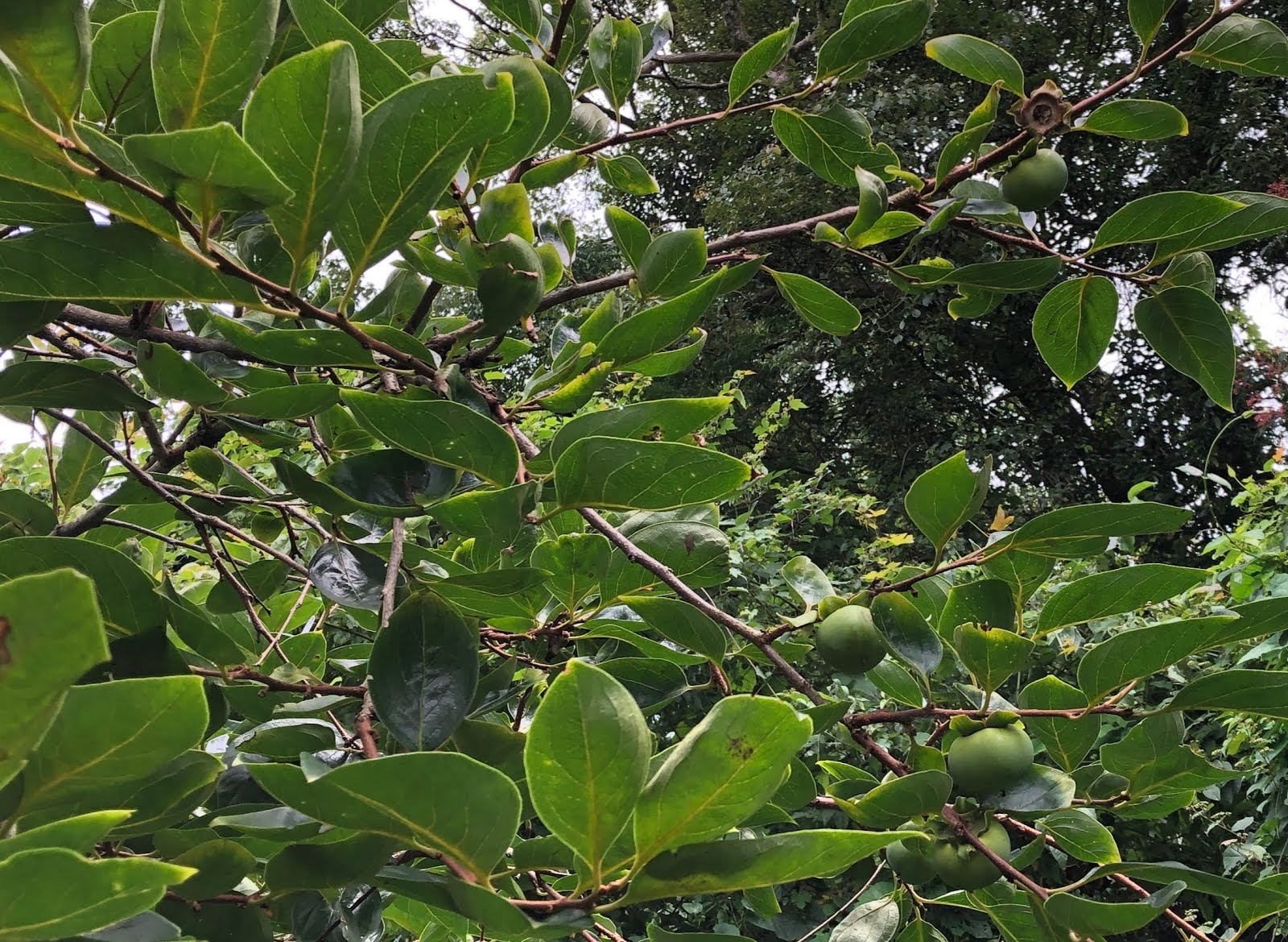 | こちらは、ここ3年間実を付けなかった富有柿の木。 この時期に残っている実はかなりの率で収穫まで行けるだろう。 |