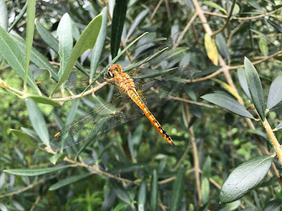 こちらは、今年花が咲いて初収穫が期待できた果樹園のオリーブ『ネバジロブランコ』。トンボが慰めてくれたが、期待した実はなっていなかった。
