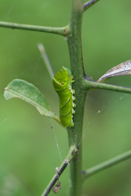 | 見慣れたナミアゲハの幼虫だ。 柚子の木は強いので、こんなことでめげることはないと思うのだが。 |