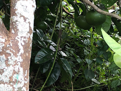 | 八朔の木は2本あるが、この木の実は去年までは鳥の餌にしかならなかった。 今年の実の大きさは、もう1本あるメインの木と変わらない。 |