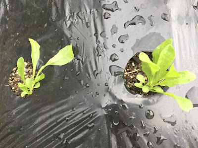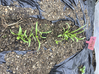 ルッコラはプランターに種蒔きしていたが、苗らしくなってきたので、昨日畝に移植した。