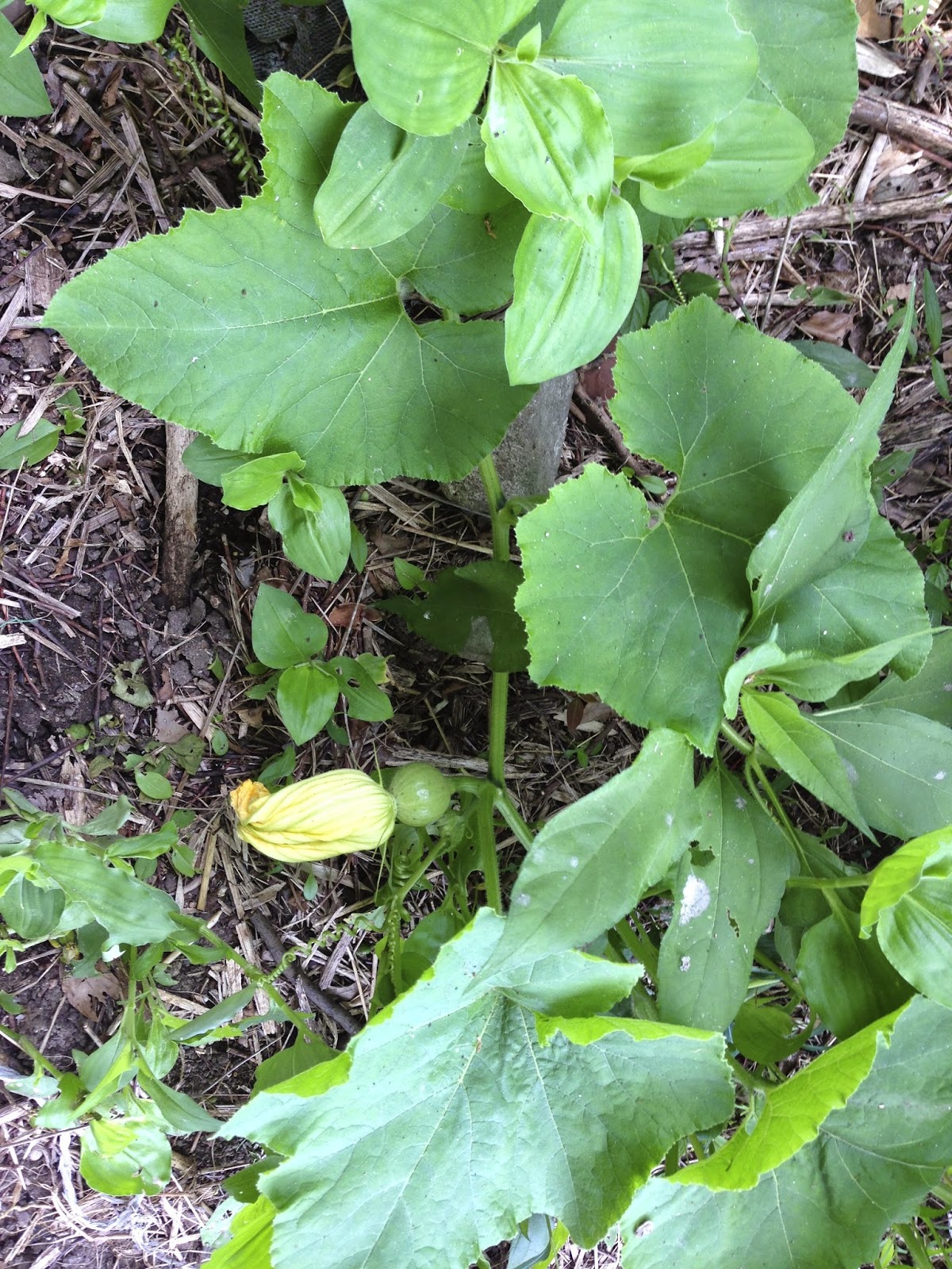 | こんな小さなカボチャも3週間後くらいには収穫だ。 それでもどこにあったか頭の隅に記憶させておかなくては取り忘れの原因になるのだ。 |