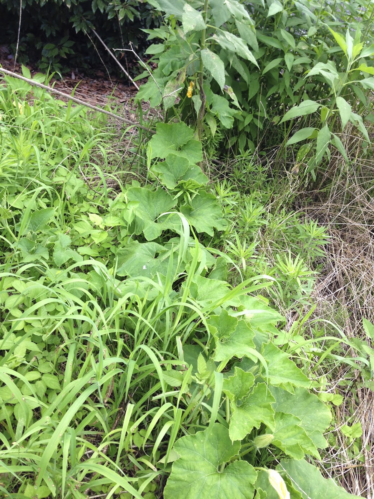 | カボチャは雑草を押しのけるように陣地を広げていった。 3kg超えの最大のカボチャはここで収穫出来た。 |