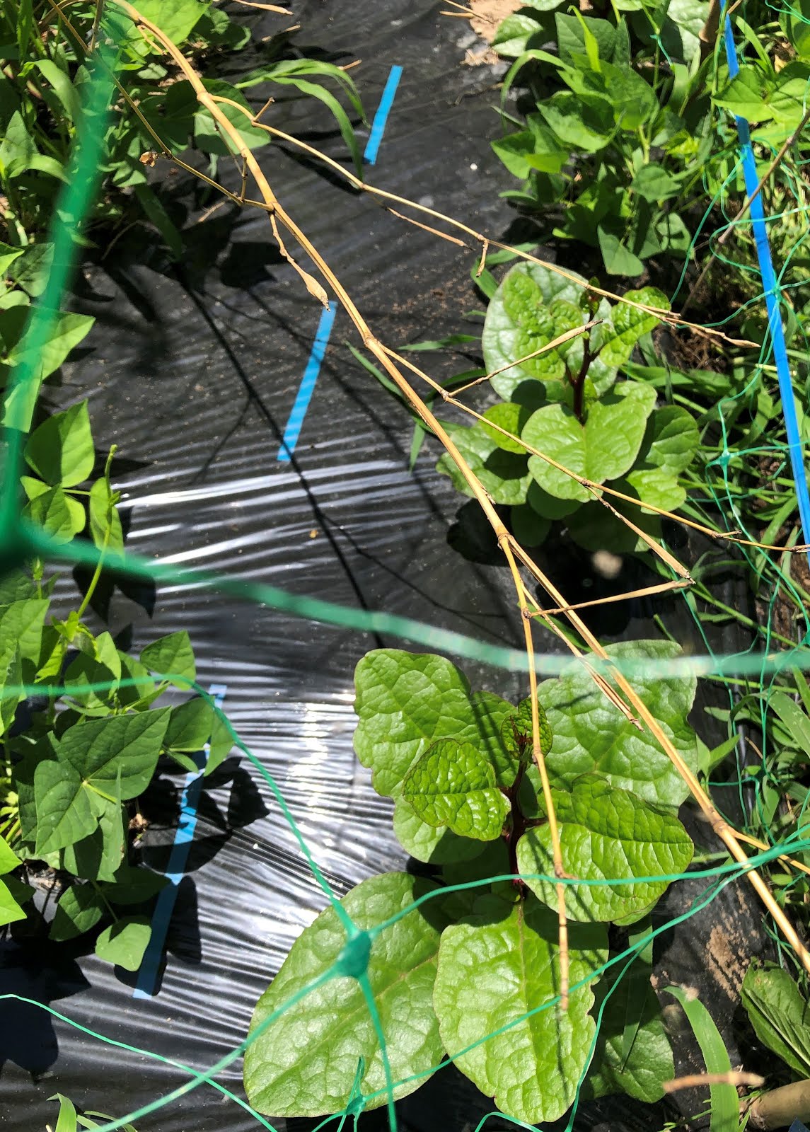 | 右に見えているツルムラサキは自然発生苗をここに移植した。 左や奥に見えている四角豆も数カ所に分けて育てている。 |