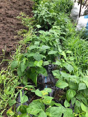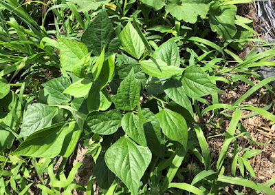 このインゲン、下の写真の蔓なしインゲンのメインの畝で採れたと思いきやそうではない。