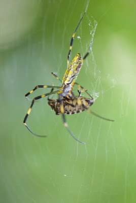 | こちらは大きなカメムシを捕まえているジョロウグモ。 |