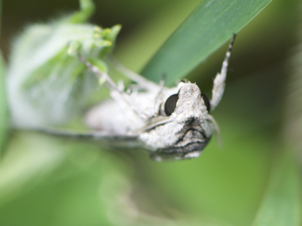 | 背中の羽もなかなか綺麗なので、悪者扱いしたくない蛾だ。 胴体が太くずんぐりしているので、あまり飛行は得意ではない。 |