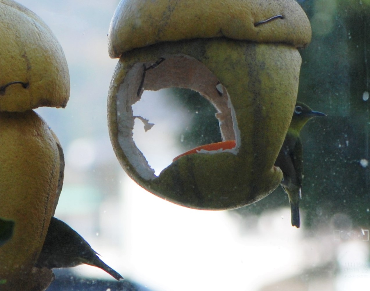 今日も室内からブラインド越しに晩白柚の家にメジロ君の姿が見える。
