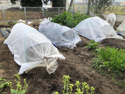 | 右2個はビニールトンネルで、温室である程度育ったポット苗を移動予定。 スペースに余裕があったらデストロイヤーの種芋も植えるかもしれない。 左は防虫ネットの上に不織布を掛けている。 |