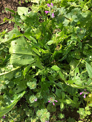 | この畝では手前と奥、2種類の種をバラ蒔きしていた。 間引き移植するにはもう育ち過ぎ? ここの苗は間引き収穫してもいいとは思われる。 |