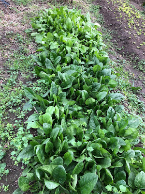 | こちらは最近のホウレン草の収穫苗。 これは種をバラ蒔きした畝で密集して出ていた芽をマルチに間引き移植した苗。 |