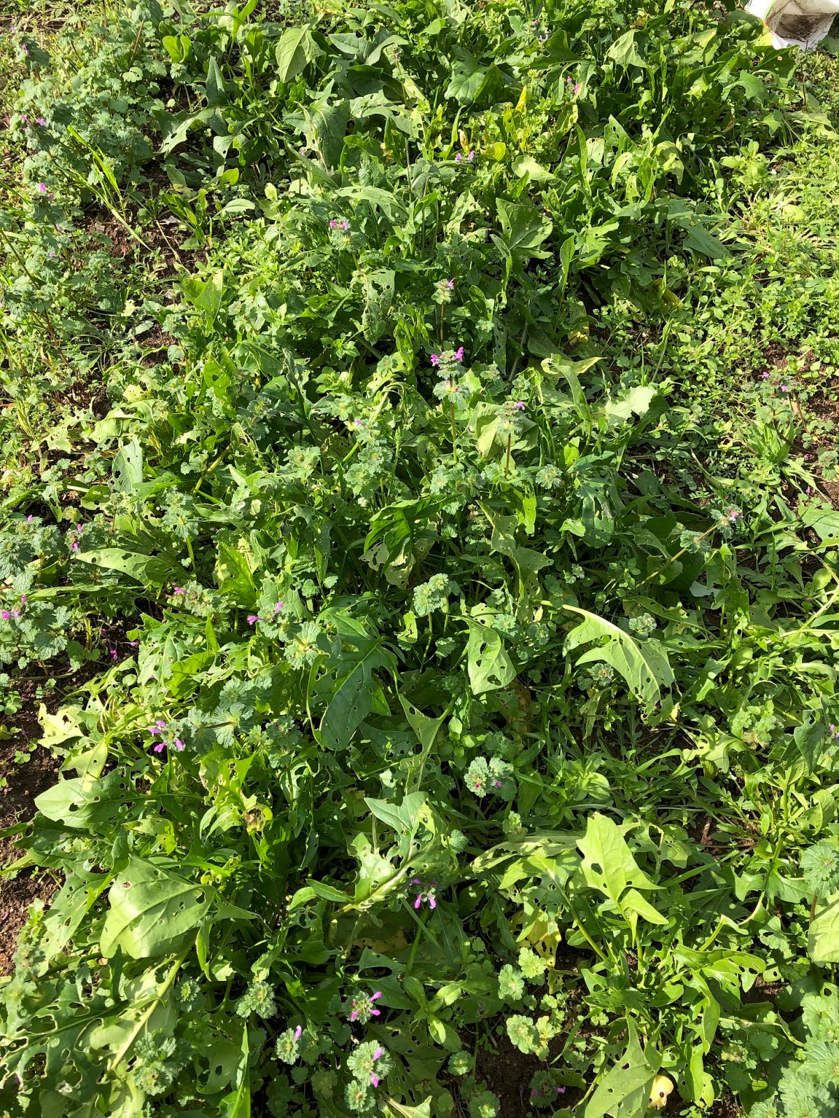 | この畝では手前と奥、2種類の種をバラ蒔きしていた。 間引き移植するにはもう育ち過ぎ? ここの苗は間引き収穫してもいいとは思われる。 |
