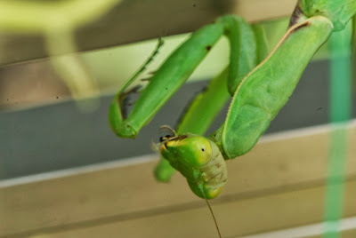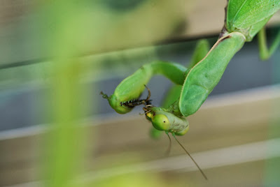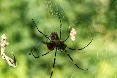 | 写真では分かりにくいが、メスが餌を食べていたら、しばらくしてオスが餌を食べにきた。 ハチの上の方にオスの細い足が数本見えている。 一つ間違えばそのままメスに食べられそうだ。 |