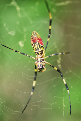 ところで、下の写真のジョロウグモ、自分の赤いお腹が気に入ったのか鏡に映った自分に見とれている。後ろの陰が何とも不気味。