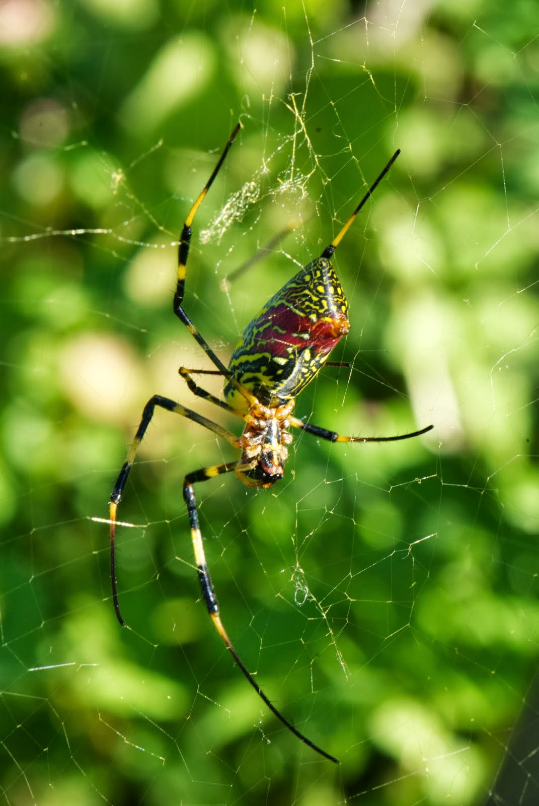 この時期、どのメスもお腹が赤くなるが、餌をそれほど取れなかったと思われる蜘蛛はちょっと痩せている。