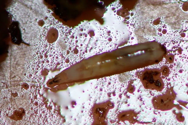 | よく見るとミミズ君にへばりついた白い小バエの幼虫(ウジ)が見える。 ミミズ君には慣れているのだがどうもウジは苦手だ。 |