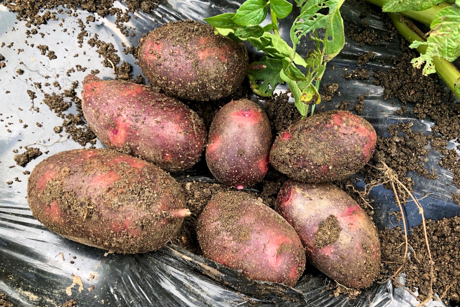 この時期に収穫すると、芋に濡れた土がついた状態。