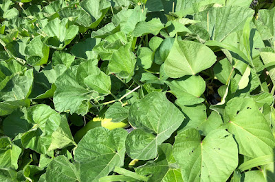| サツマイモを育てるはずの畝が、ほとんど中長ズッキーニの蔓葉で埋め尽くされている。 この蔓葉の成長力はとにかく凄い。 |