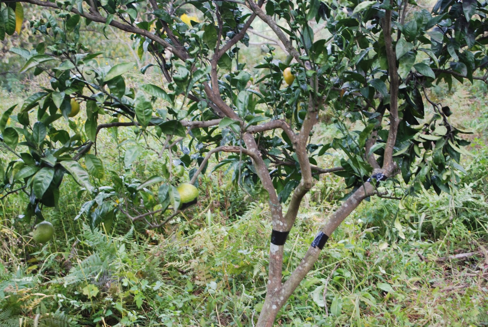 この木の奥にある八朔。こちらは去年サルの被害に遭わなかったので今年も元気だ